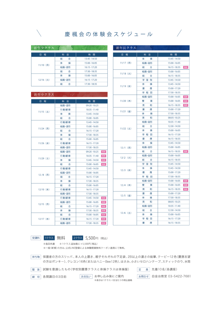 小学校受験コース 新年長・新年中・新年少 授業体験会開催