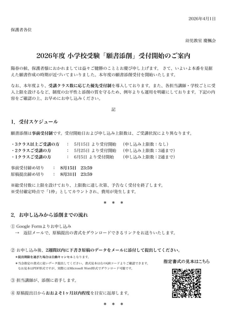 2026年度 小学校受験「願書添削」受付開始のご案内
