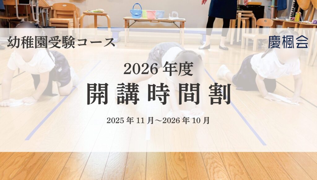 幼稚園受験コースの、2026年度(2025年11月〜2026年10月)の開講時間割をお知らせします。 こちらに記載の内容は予定です。実際の開講時間割は異なる可能性がありますの... -